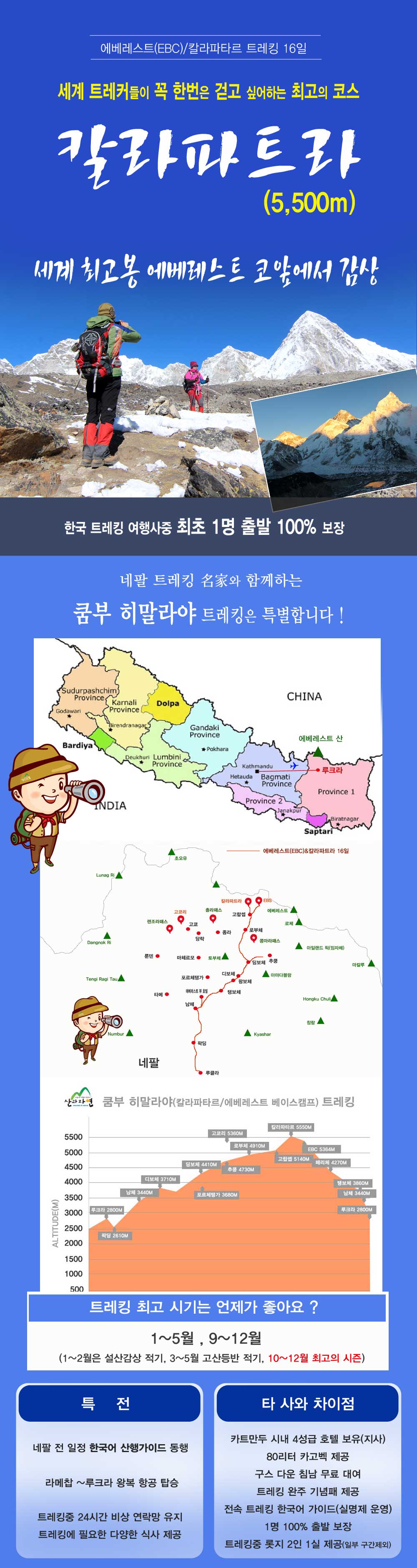 - 여행개시 30일전(~30)까지 통보시: 국내선(카트만두 또는 라차메–루크라 항공) 취소 수수료 100$+여행경비 100% 환급