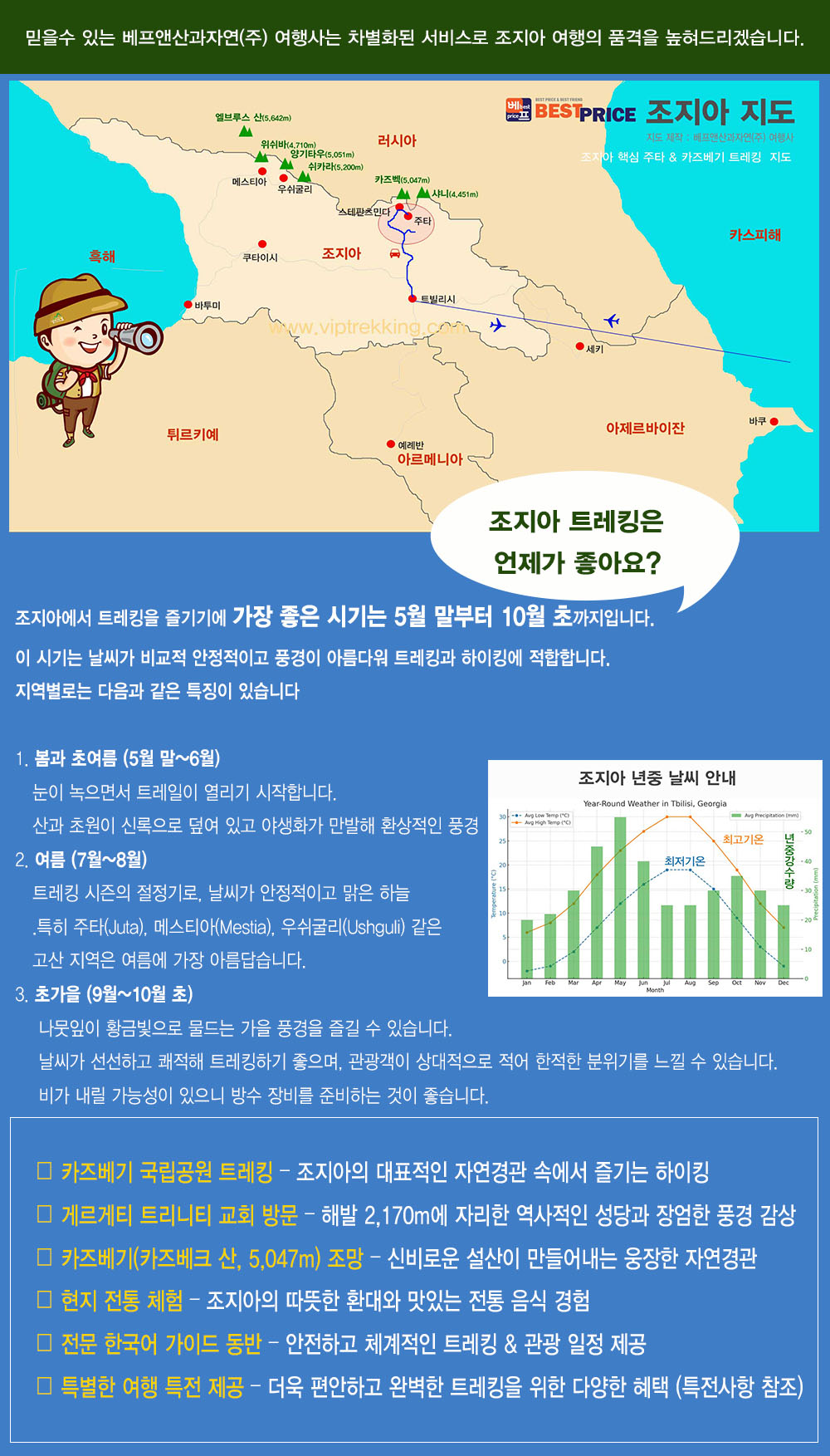 조지아: 5~6월, 9~10월은 쾌적한 날씨와 풍경을 즐길 수 있는 최적기입니다.
