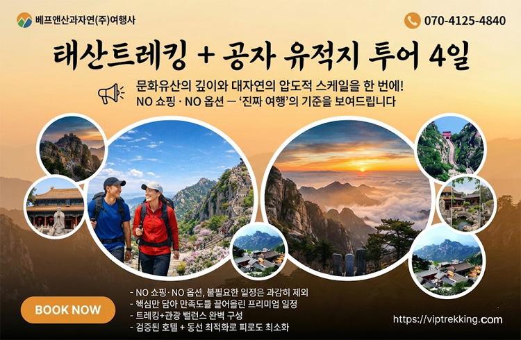 이번 여정은 인류의 스승 공자의 발자취가 살아 숨 쉬는 **곡부(Qufu)**와 중국 황제들이 봉선을 올리던 신성한 **태산(Taishan)**을 집중적으로 돌아보는 알찬 일정입니다. 7,000년 중국 역사의 정수를 느끼고 싶은 분들과 압도적인 비경 속에서 진정한 트레킹의 성취감을 느끼고 싶은 분들께 최고의 선택이 될 것입니다.