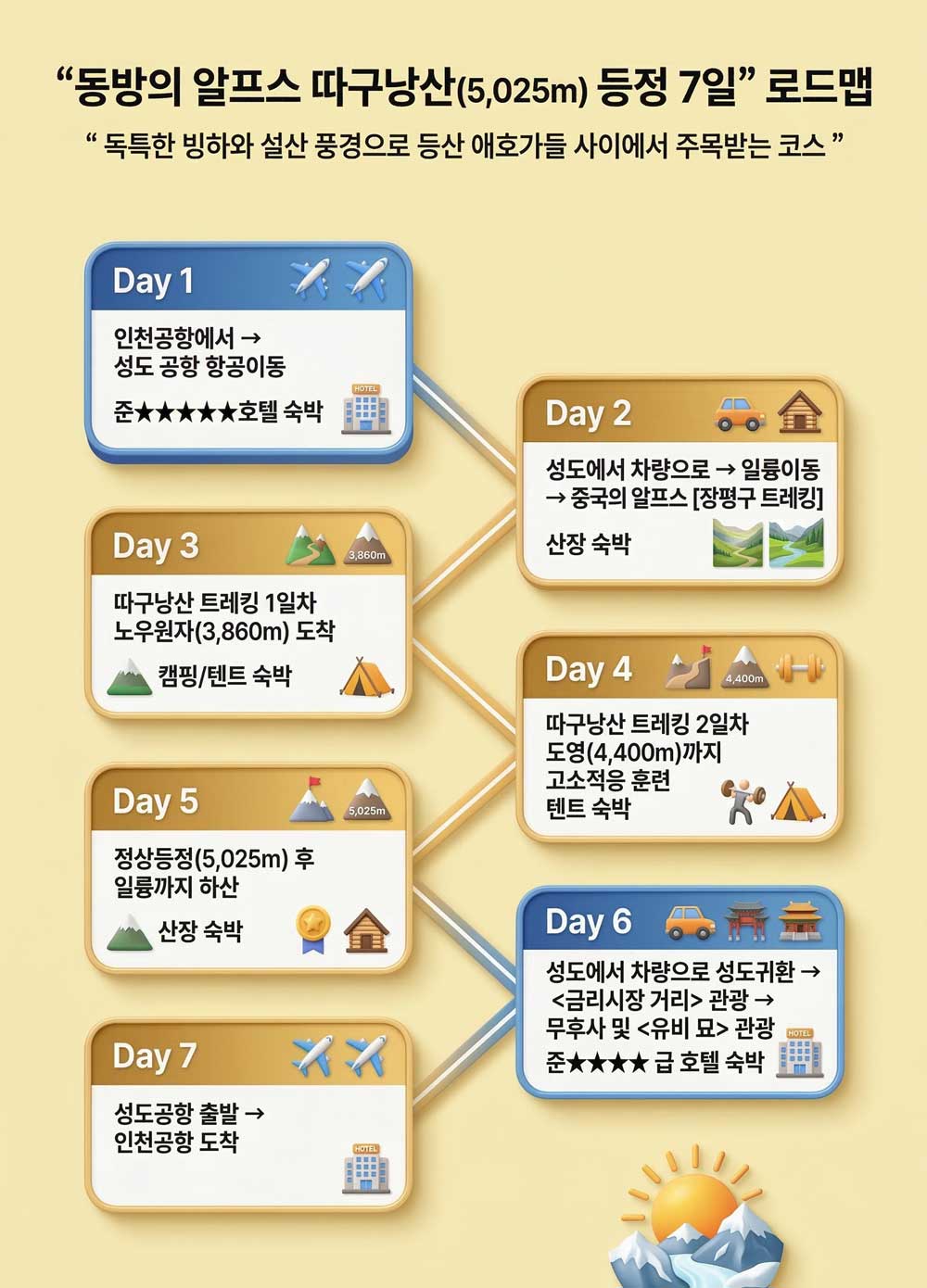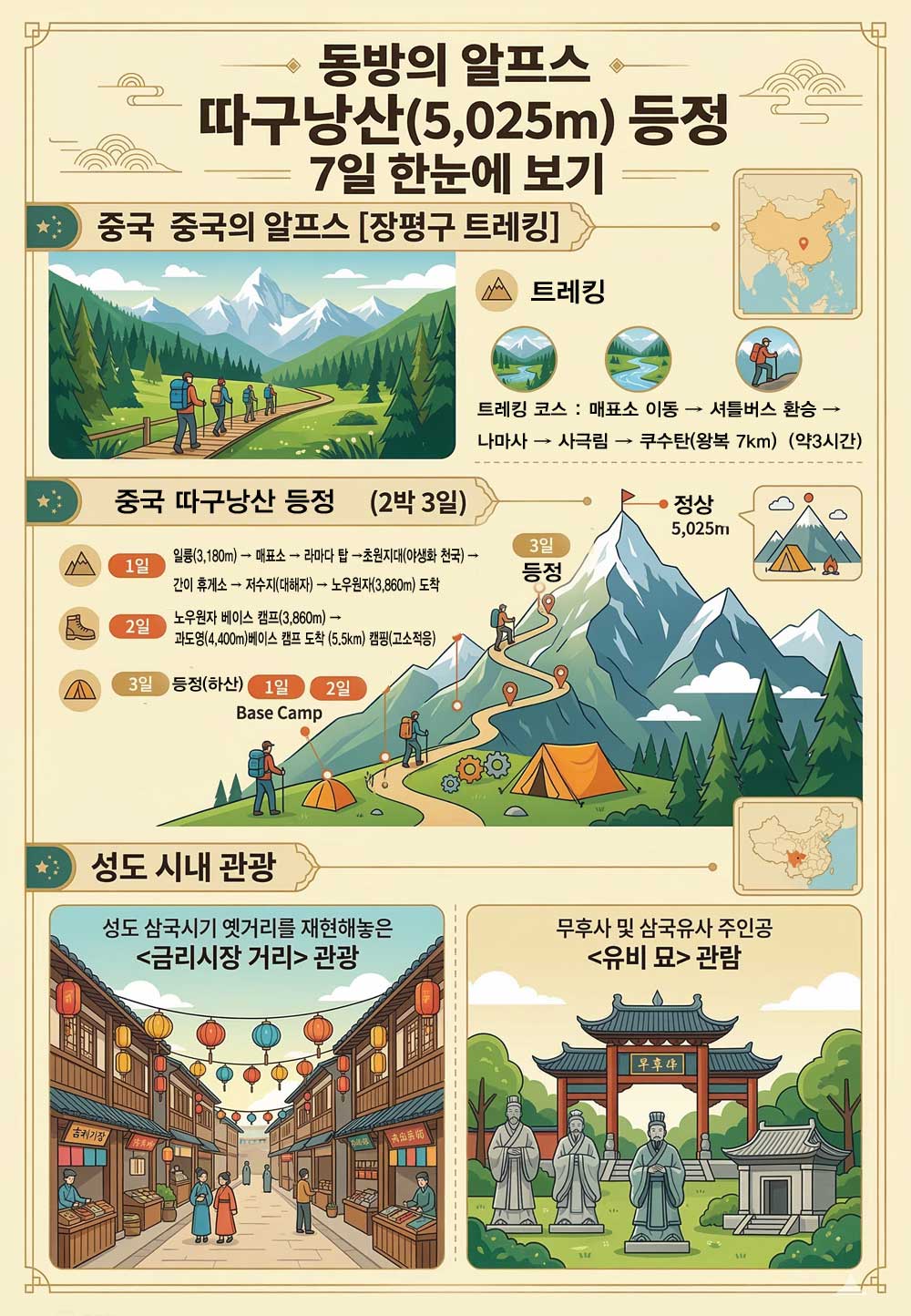 - 동티벳지역은 해발이 3,000미터가 넘으므로 음주을 삼가하시고,고산증이 올수도 있으니 비상약 준비해주시길 바랍니다.