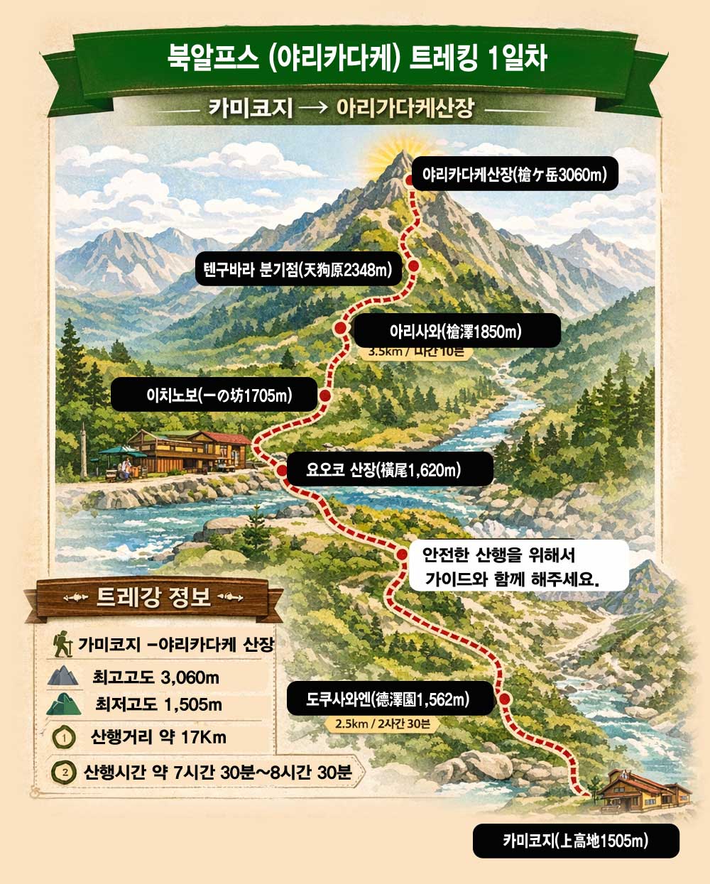 - 일본 트레킹은 고산트레킹으로 곳곳에 위험한 지역과 고산병으로 인해 사고 위험이 상존하니, 반드시 가이드을 지시를 따라주셔야 하며, 불응으로 인해서 발생되는 모든 사고는 고객님이 책임을 지셔야 합니다.