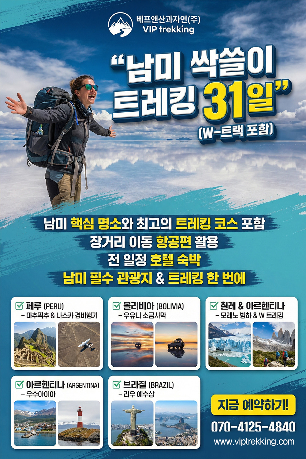 - 상품 이용일 18일전(18~3)까지 통보시: 위약금 700,000원 + 남미내 항공권+파타고니나 w 트레킹 산장비용+여행요금의 70% 취소 수수료 발생