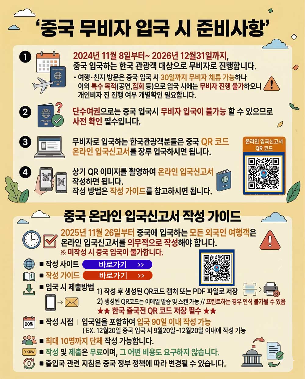 - 중국은 출입국시 단체비자 또는 개인비자가 반드시 필요합니다.
