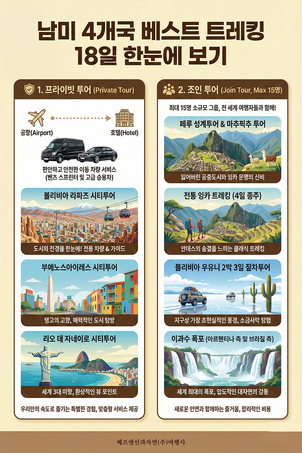 ▶ 본 상품은 예약이 들어온 후에 팀 출발 확정된 이후 남미내 항공권을 구매 진행 됩니다. 정확한 영문으로 예약넣어주셔야하며, 항공상황에 따라 좌석수만 별개로 진행이 불가할 수 있습니다.