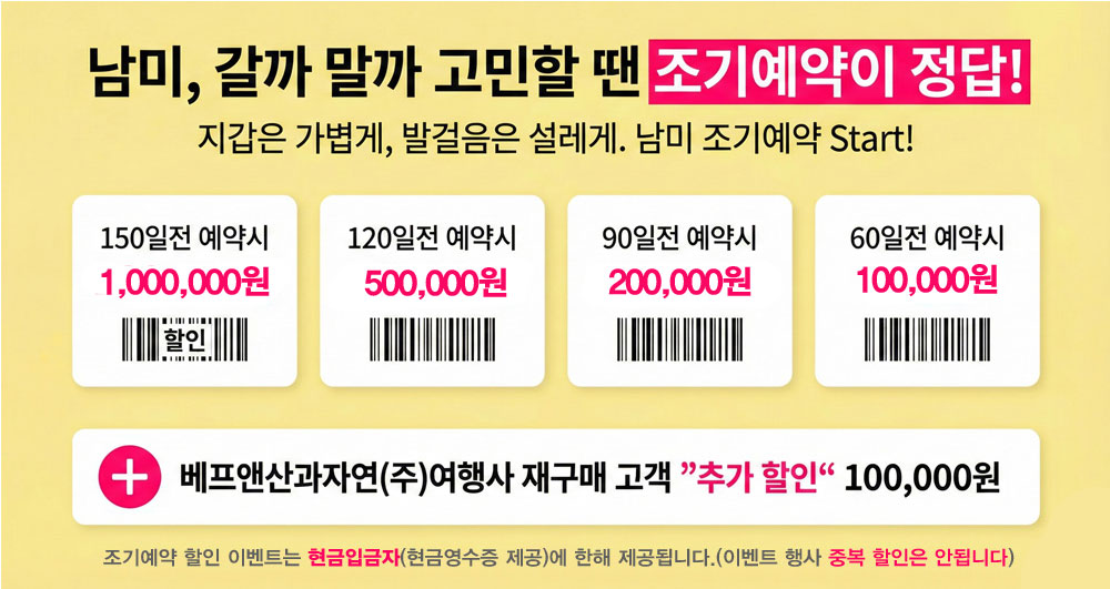 - 본 여행상품은 최소인원이 되어야 확정되는 상품으로 확정 후에야 항공권구매에 들어가는 관계로 예약시점에 따라 기본항공권 좌석이 없는 경우 추가로 부담해야 하므로 추가금액이 발생하며 전체 상품가격이 올라갈 수 있습니다.
