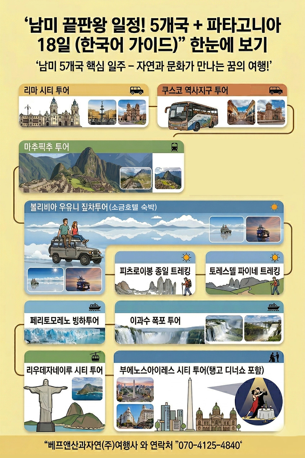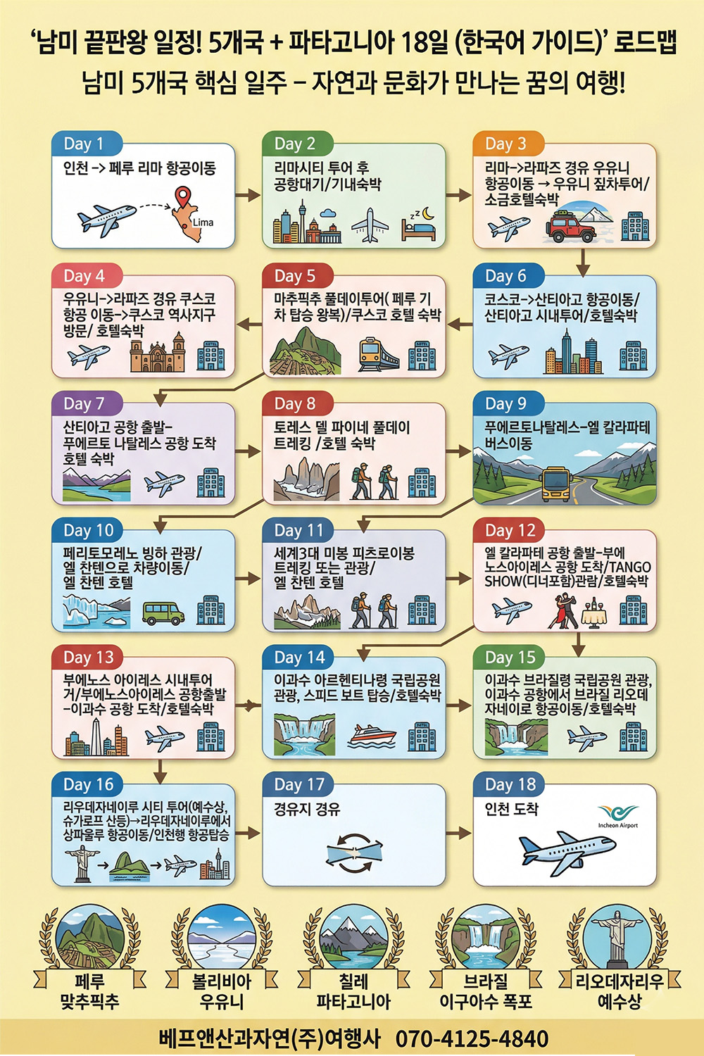 ▶ 중남미 상품은 항공 이동이 많아 항공 좌석상황에 따라 일정이나 항공 여정의 변동이 많습니다.